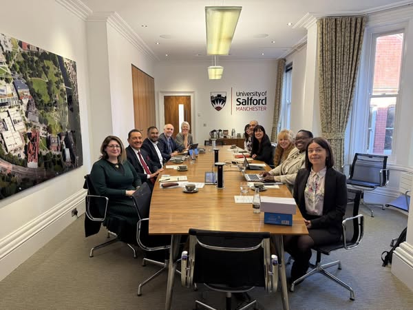 واستعرض فريق الجامعة خلال اللقاء برامج وتخصصات جامعة سالفورد وخصوصاً هندسة العمارة والبيئة والهندسة المدنية وهندسة الروبوت وهندسة وعلوم الصوت والفضاء والاتصالات والميكانيك والعلوم الطبية والتمريض واللغات والعلوم السياسية وعلوم الإجتماع والذكاء الإصطناعي والإقتصاد والعلاج الطبيعي (Physiotherapy) …